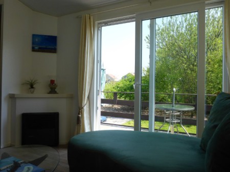 Gemütliches Wohnzimmer mit großen Fenstern.