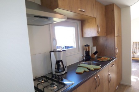 Eine komplett eingerichtete Küche mit Gasherd, Kaffeemaschine, Wasserkocher, Toaster, Mikrowelle und Minibackofen, etc...