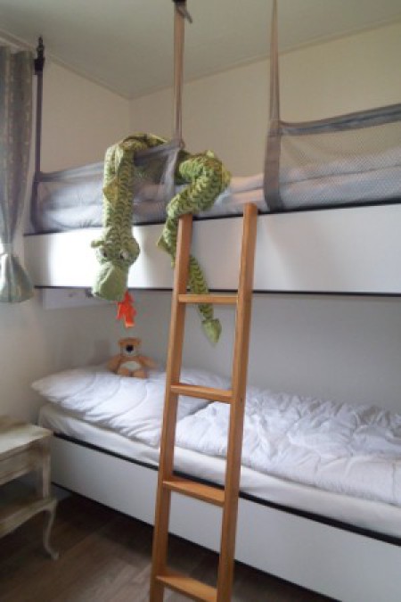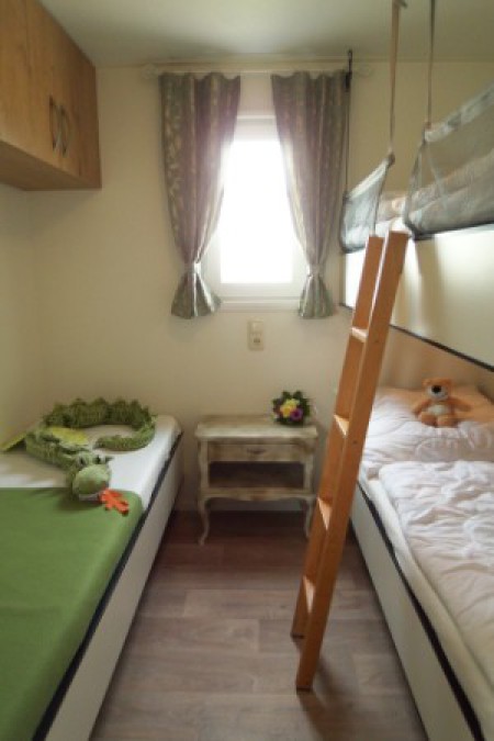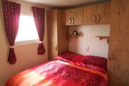 Ein geräumiges Häuschen mit insgesamt zwei Schlafzimmern (1 Doppelbettzimmer- franz. Bett, 1 Etagenbettzimmer) in jedem Schlafzimmer befinden sich Kleiderschränke.
