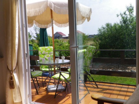 Es sind Gartenstühle,Tisch und ein Sonnenschirm vorhanden.